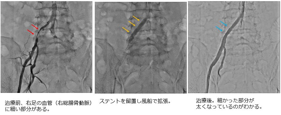 歩くと足が痛くて休むと治る(間欠性跛行)、足の先が冷たくて黒ずんでくる、足のケガが治らないなどの症状がでます。特に糖尿病や喫煙をしている方に多い病気です。治療が遅れて、足が腐ってしまうと、切断しなくてはならないこともあります。