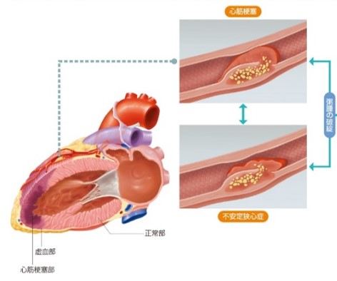 心臓の筋肉には冠動脈と呼ばれる3本の血管が、栄養を送っています。この血管が心臓に血液を送っている血管(冠動脈)が細くなるか、詰まってしまうことにより、心臓の筋肉に血液が回らなくなり、心臓が壊死を起こしてしまう病気です。急激な胸の痛みや、運動時の胸の痛みなど、様々な症状で発症いたします。特に、急に冠動脈が閉塞してしまう急性冠症候群は、数分以内に死に至る可能性のある、非常に恐ろしい病気です。